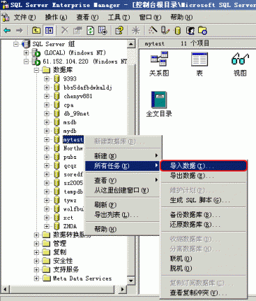 1.右击您准备导入数据的数据库,选择“所有任务”下的“导入数据”